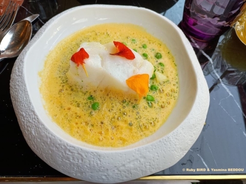 Cod with nasturtium broth and green peas